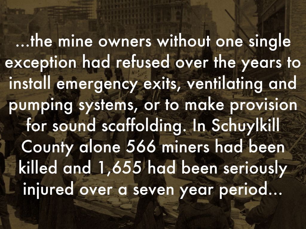 ...the mine owners without one single exception had refused over the years to install emergency exits, ventilating and pumping systems, or to make provision for sound scaffolding. In Schuylkill County alone 566 miners had been killed and 1,655 had been seriously injured over a seven year period...