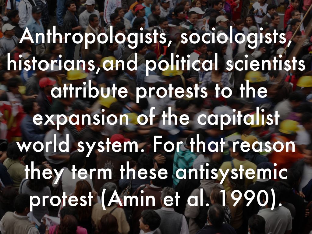 Anthropologists, sociologists, historians,and political scientists attribute protests to the expansion of the capitalist world system. For that reason they term these antisystemic protest (Amin et al. 1990).
