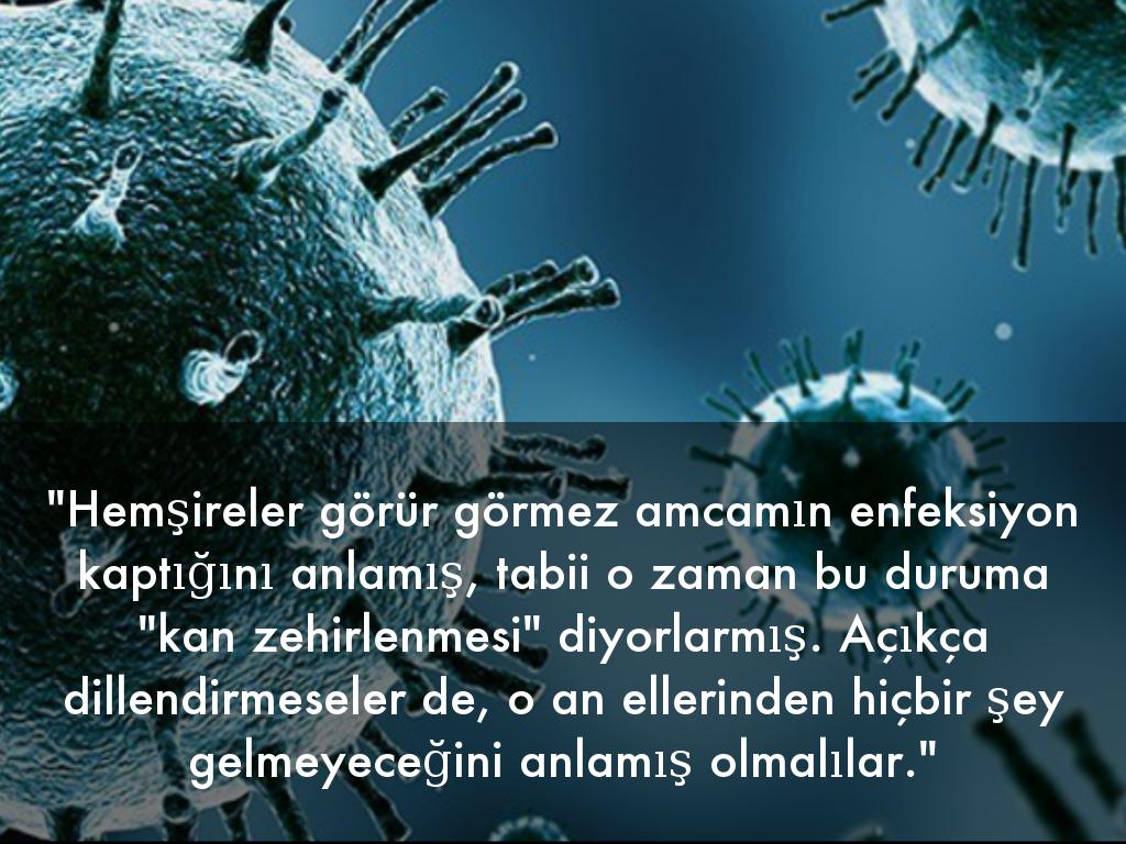 "Hemşireler görür görmez amcamın enfeksiyon kaptığını anlamış, tabii o zaman bu duruma "kan zehirlenmesi" diyorlarmış. Açıkça dillendirmeseler de, o an ellerinden hiçbir şey gelmeyeceğini anlamış olmalılar."