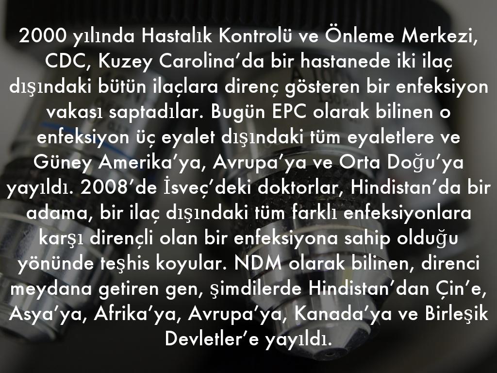2000 yılında Hastalık Kontrolü ve Önleme Merkezi, CDC, Kuzey Carolina’da bir hastanede iki ilaç dışındaki bütün ilaçlara direnç gösteren bir enfeksiyon vakası saptadılar. Bugün EPC olarak bilinen o enfeksiyon üç eyalet dışındaki tüm eyaletlere ve Güney Amerika’ya, Avrupa’ya ve Orta Doğu’ya yayıldı. 2008’de İsveç’deki doktorlar, Hindistan’da bir adama, bir ilaç dışındaki tüm farklı enfeksiyonlara karşı dirençli olan bir enfeksiyona sahip olduğu yönünde teşhis koyular. NDM olarak bilinen, direnci meydana getiren gen, şimdilerde Hindistan’dan Çin’e, Asya’ya, Afrika’ya, Avrupa’ya, Kanada’ya ve Birleşik Devletler’e yayıldı.