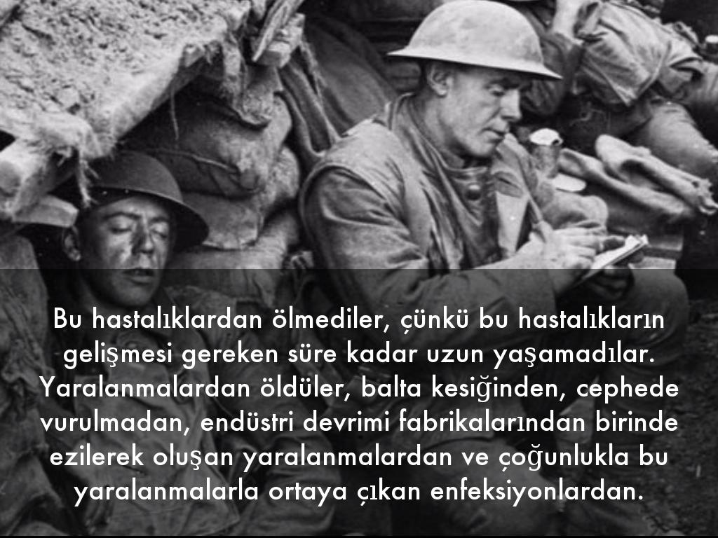 Bu hastalıklardan ölmediler, çünkü bu hastalıkların gelişmesi gereken süre kadar uzun yaşamadılar. Yaralanmalardan öldüler, balta kesiğinden, cephede vurulmadan, endüstri devrimi fabrikalarından birinde ezilerek oluşan yaralanmalardan ve çoğunlukla bu yaralanmalarla ortaya çıkan enfeksiyonlardan.