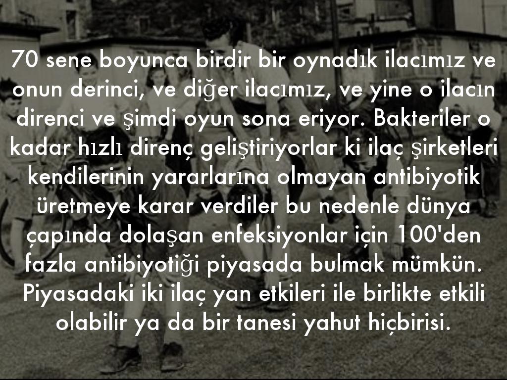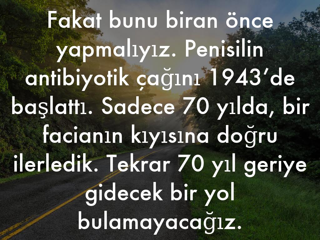 Fakat bunu biran önce yapmalıyız. Penisilin antibiyotik çağını 1943’de başlattı. Sadece 70 yılda, bir facianın kıyısına doğru ilerledik. Tekrar 70 yıl geriye gidecek bir yol bulamayacağız.