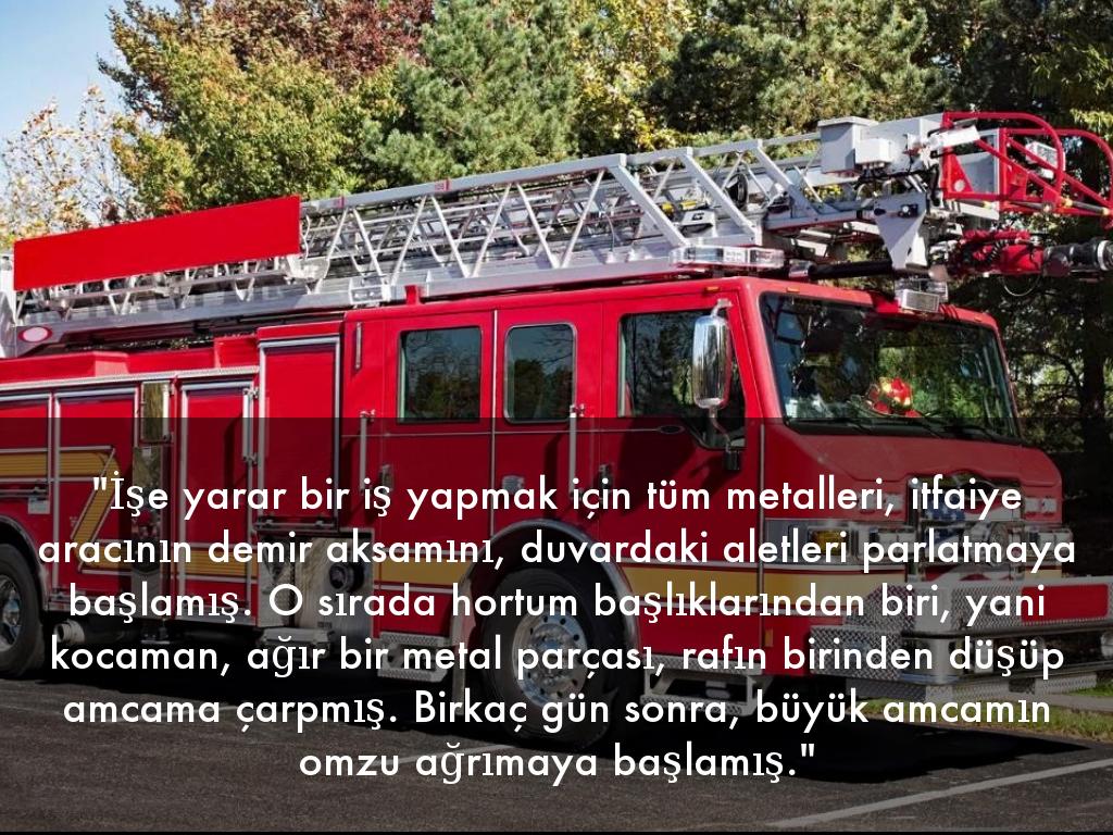 "İşe yarar bir iş yapmak için tüm metalleri, itfaiye aracının demir aksamını, duvardaki aletleri parlatmaya başlamış. O sırada hortum başlıklarından biri, yani kocaman, ağır bir metal parçası, rafın birinden düşüp amcama çarpmış. Birkaç gün sonra, büyük amcamın omzu ağrımaya başlamış."
