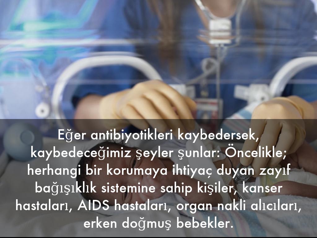 Eğer antibiyotikleri kaybedersek, kaybedeceğimiz şeyler şunlar: Öncelikle; herhangi bir korumaya ihtiyaç duyan zayıf bağışıklık sistemine sahip kişiler, kanser hastaları, AIDS hastaları, organ nakli alıcıları, erken doğmuş bebekler.