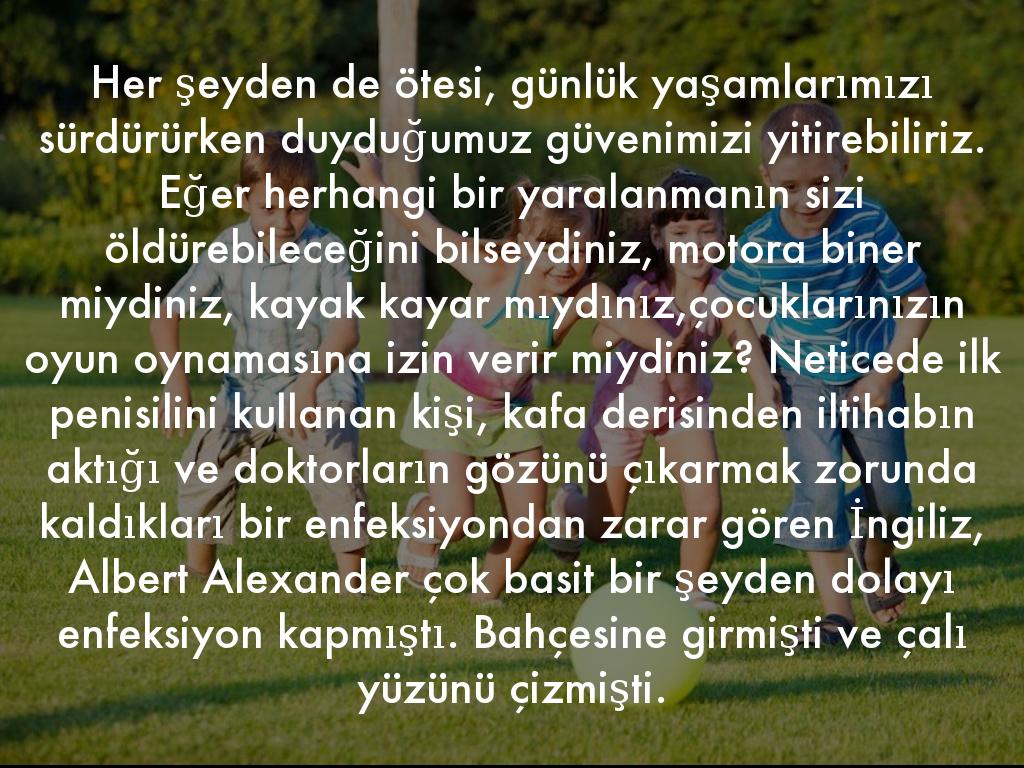 Her şeyden de ötesi, günlük yaşamlarımızı sürdürürken duyduğumuz güvenimizi yitirebiliriz. Eğer herhangi bir yaralanmanın sizi öldürebileceğini bilseydiniz, motora biner miydiniz, kayak kayar mıydınız,çocuklarınızın oyun oynamasına izin verir miydiniz? Neticede ilk penisilini kullanan kişi, kafa derisinden iltihabın aktığı ve doktorların gözünü çıkarmak zorunda kaldıkları bir enfeksiyondan zarar gören İngiliz, Albert Alexander çok basit bir şeyden dolayı enfeksiyon kapmıştı. Bahçesine girmişti ve çalı yüzünü çizmişti.