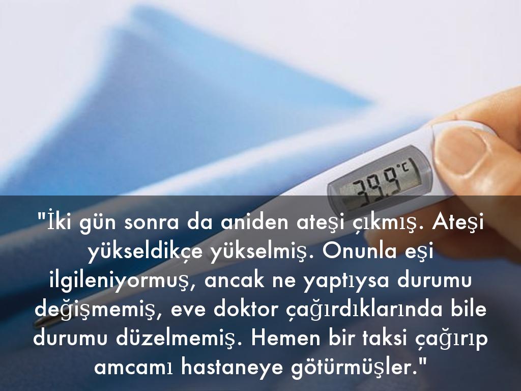 "İki gün sonra da aniden ateşi çıkmış. Ateşi yükseldikçe yükselmiş. Onunla eşi ilgileniyormuş, ancak ne yaptıysa durumu değişmemiş, eve doktor çağırdıklarında bile durumu düzelmemiş. Hemen bir taksi çağırıp amcamı hastaneye götürmüşler."
