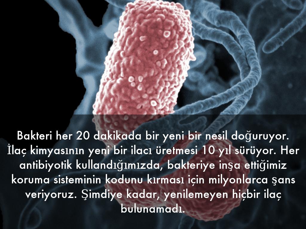 Bakteri her 20 dakikada bir yeni bir nesil doğuruyor. İlaç kimyasının yeni bir ilacı üretmesi 10 yıl sürüyor. Her antibiyotik kullandığımızda, bakteriye inşa ettiğimiz koruma sisteminin kodunu kırması için milyonlarca şans veriyoruz. Şimdiye kadar, yenilemeyen hiçbir ilaç bulunamadı.