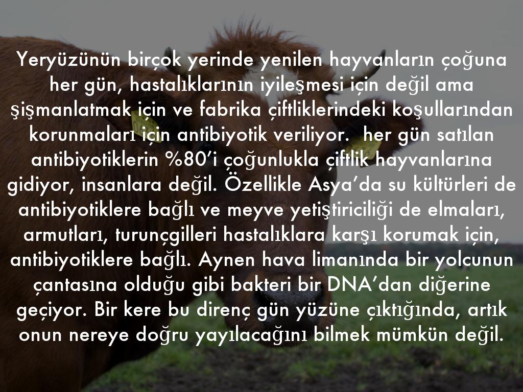 Yeryüzünün birçok yerinde yenilen hayvanların çoğuna her gün, hastalıklarının iyileşmesi için değil ama şişmanlatmak için ve fabrika çiftliklerindeki koşullarından korunmaları için antibiyotik veriliyor. her gün satılan antibiyotiklerin %80’i çoğunlukla çiftlik hayvanlarına gidiyor, insanlara değil. Özellikle Asya’da su kültürleri de antibiyotiklere bağlı ve meyve yetiştiriciliği de elmaları, armutları, turunçgilleri hastalıklara karşı korumak için, antibiyotiklere bağlı. Aynen hava limanında bir yolcunun çantasına olduğu gibi bakteri bir DNA’dan diğerine geçiyor. Bir kere bu direnç gün yüzüne çıktığında, artık onun nereye doğru yayılacağını bilmek mümkün değil.