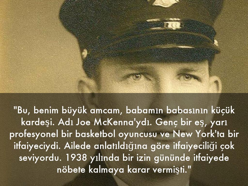 "Bu, benim büyük amcam, babamın babasının küçük kardeşi. Adı Joe McKenna'ydı. Genç bir eş, yarı profesyonel bir basketbol oyuncusu ve New York'ta bir itfaiyeciydi. Ailede anlatıldığına göre itfaiyeciliği çok seviyordu. 1938 yılında bir izin gününde itfaiyede nöbete kalmaya karar vermişti."