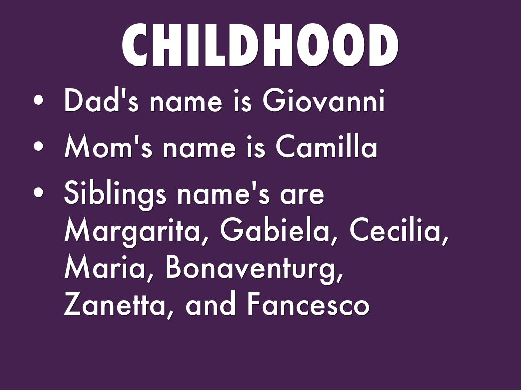 Siblings name's are Margarita, Gabiela, Cecilia, Maria, Bonaventurg, Zanetta, and Fancesco