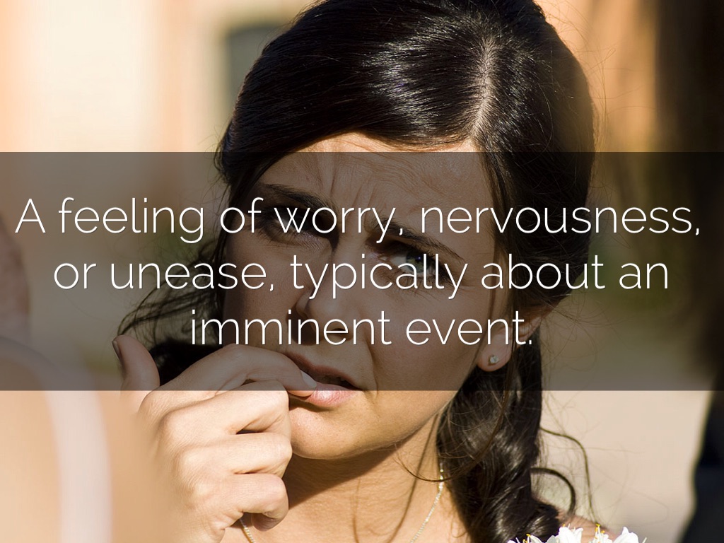 A feeling of worry, nervousness, or unease, typically about an imminent event.