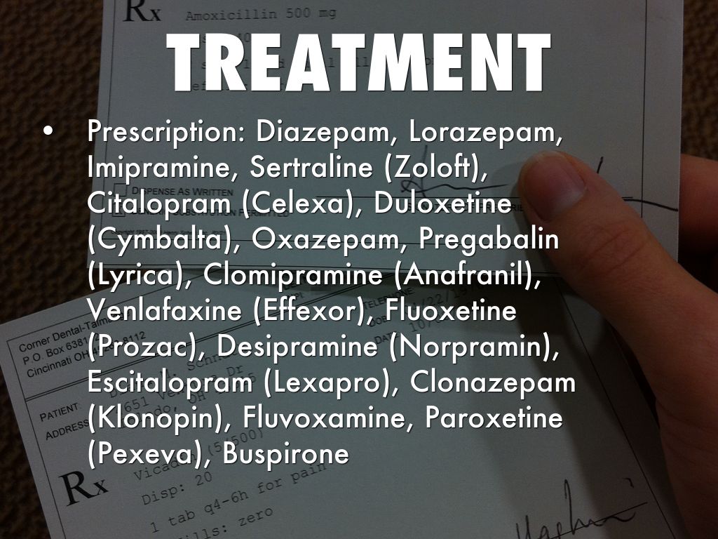 Prescription: Diazepam, Lorazepam, Imipramine, Sertraline (Zoloft), Citalopram (Celexa), Duloxetine (Cymbalta), Oxazepam, Pregabalin (Lyrica), Clomipramine (Anafranil), Venlafaxine (Effexor), Fluoxetine (Prozac), Desipramine (Norpramin), Escitalopram (Lexapro), Clonazepam (Klonopin), Fluvoxamine, Paroxetine (Pexeva), Buspirone