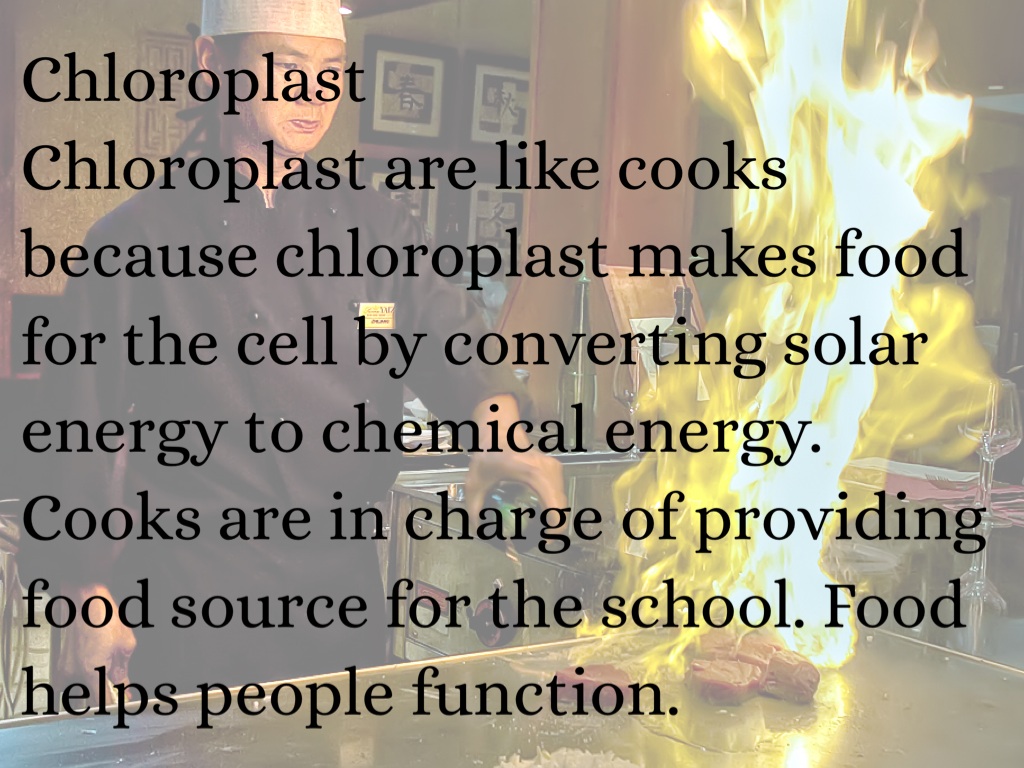 Chloroplast are like cooks because chloroplast makes food for the cell by converting solar energy to chemical energy. Cooks are in charge of providing food source for the school. Food helps people function.
