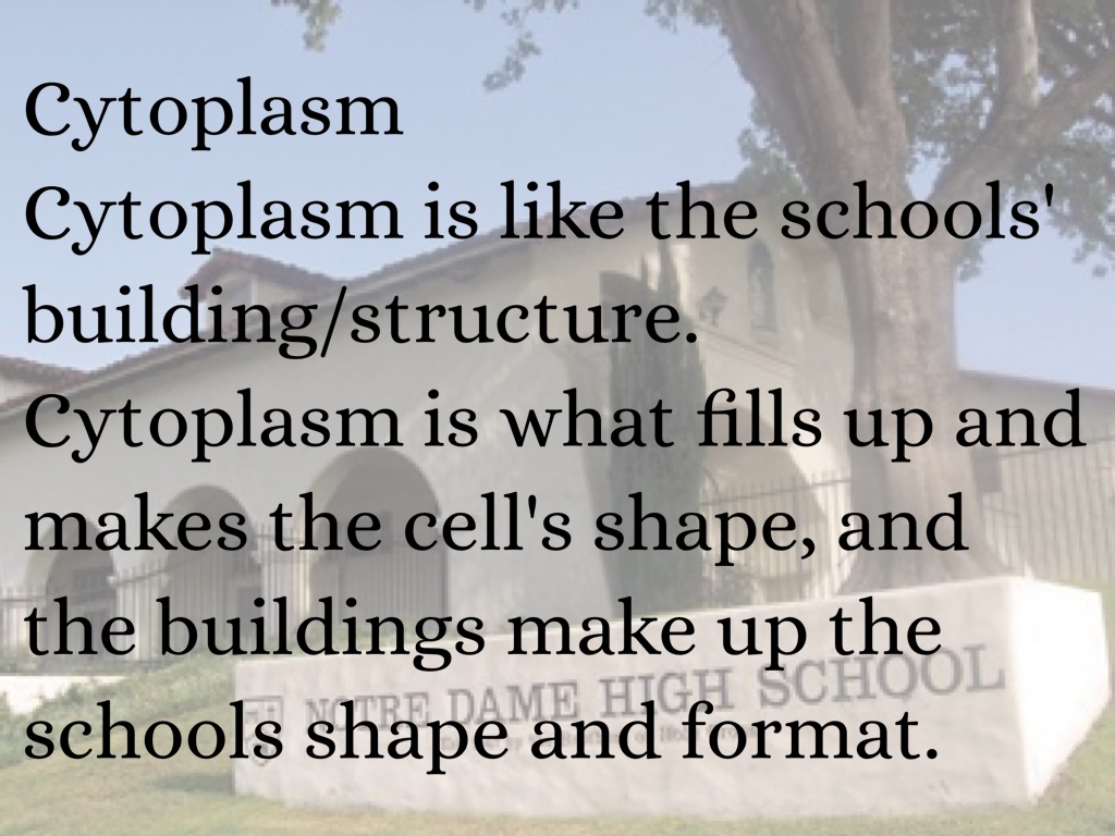 Cytoplasm is like the schools' building/structure. Cytoplasm is what fills up and makes the cell's shape, and the buildings make up the schools shape and format.