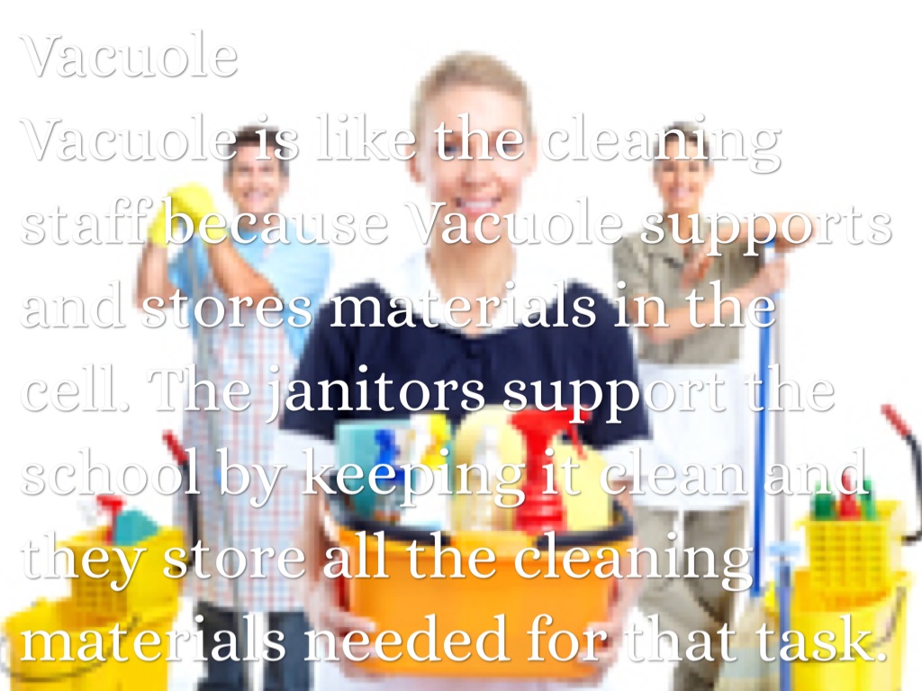 Vacuole is like the cleaning staff because Vacuole supports and stores materials in the cell. The janitors support the school by keeping it clean and they store all the cleaning materials needed for that task.