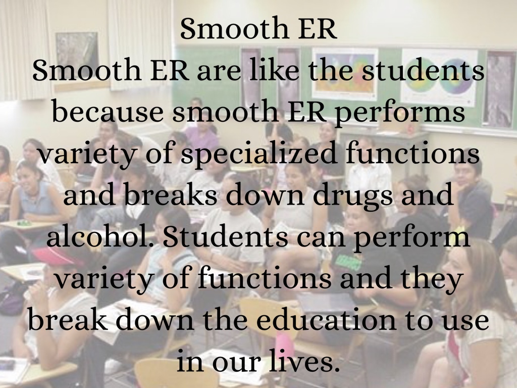 Smooth ER are like the students because smooth ER performs variety of specialized functions and breaks down drugs and alcohol. Students can perform variety of functions and they break down the education to use in our lives.