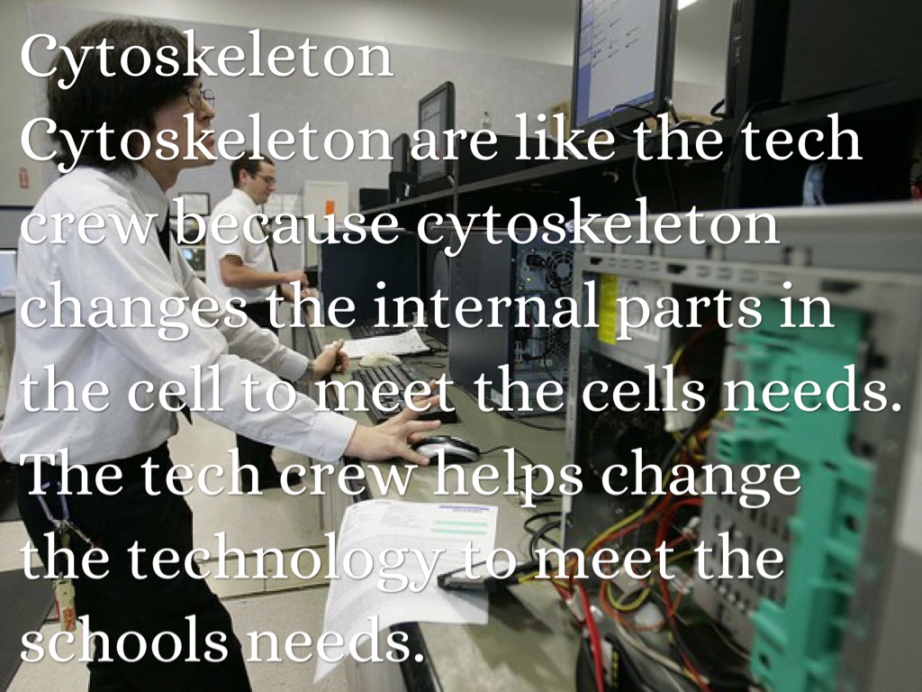 Cytoskeleton are like the tech crew because cytoskeleton changes the internal parts in the cell to meet the cells needs. The tech crew helps change the technology to meet the schools needs.