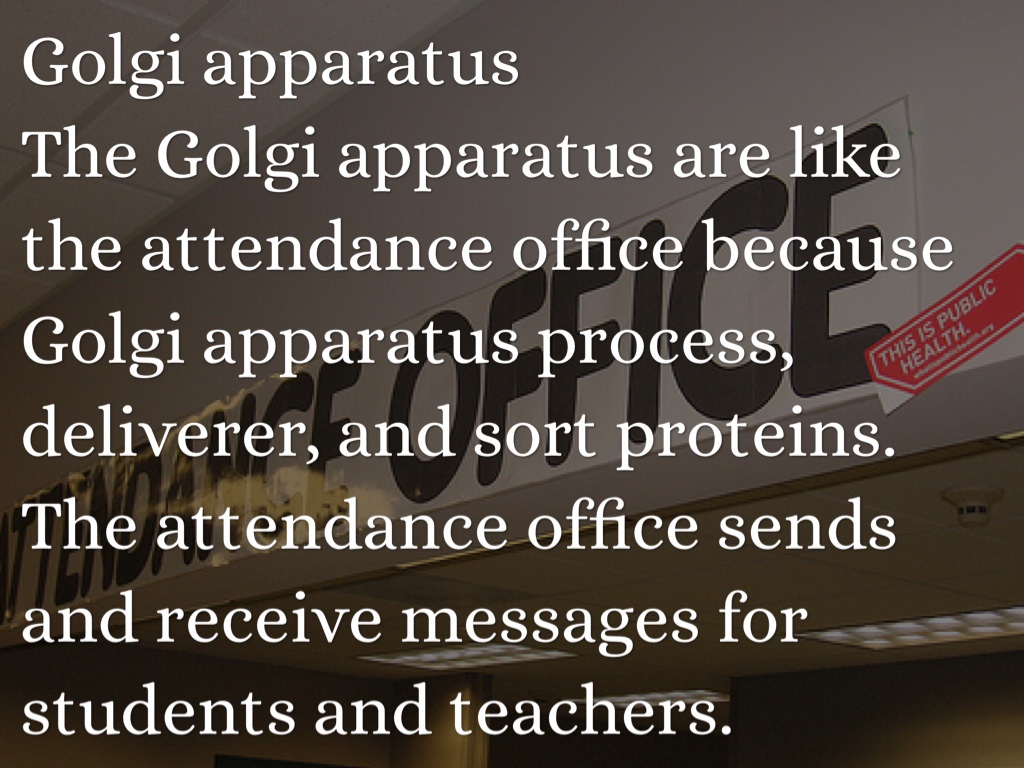 The Golgi apparatus are like the attendance office because Golgi apparatus process, deliverer, and sort proteins. The attendance office sends and receive messages for students and teachers.