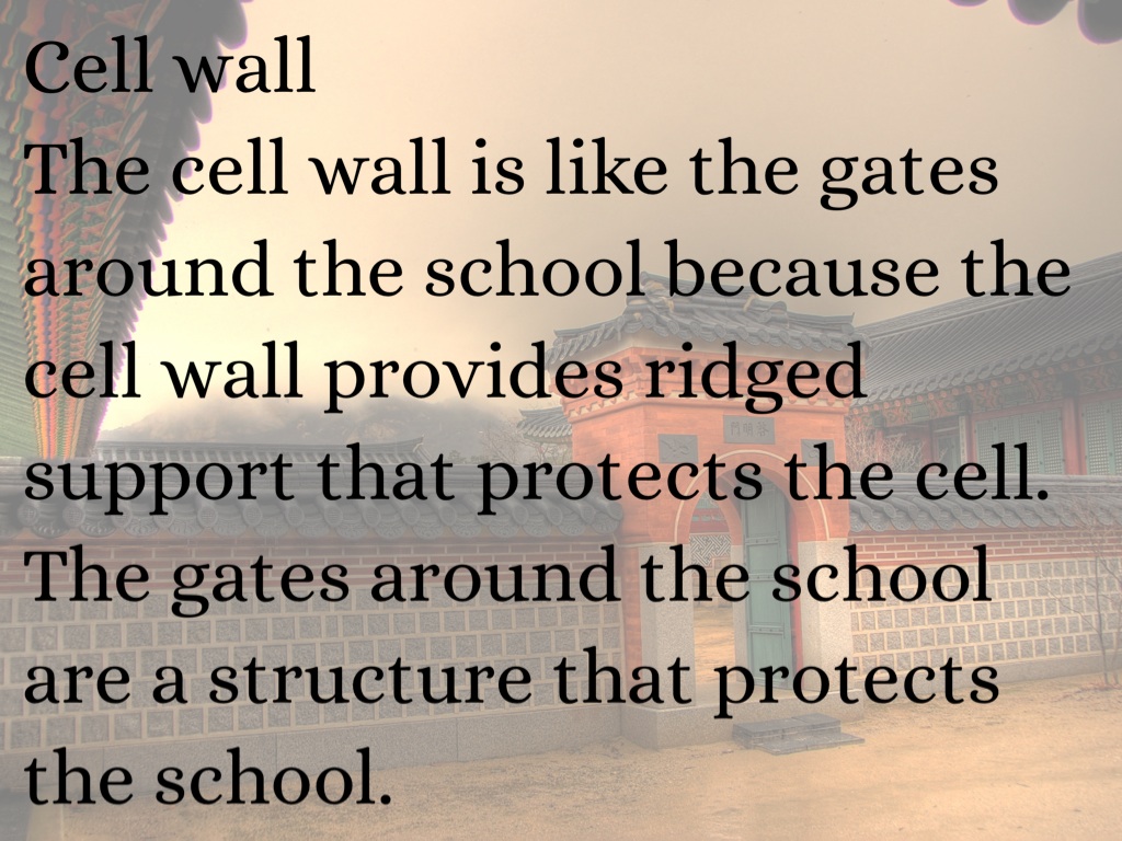 The cell wall is like the gates around the school because the cell wall provides ridged support that protects the cell. The gates around the school are a structure that protects the school.