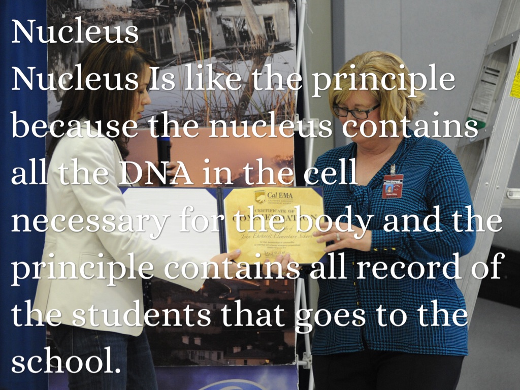 Nucleus Is like the principle because the nucleus contains all the DNA in the cell necessary for the body and the principle contains all record of the students that goes to the school.