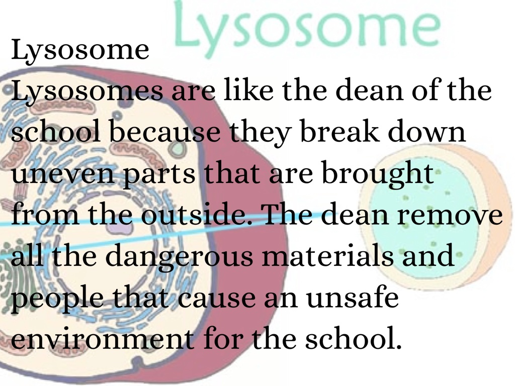 Lysosomes are like the dean of the school because they break down uneven parts that are brought from the outside. The dean remove all the dangerous materials and people that cause an unsafe environment for the school.