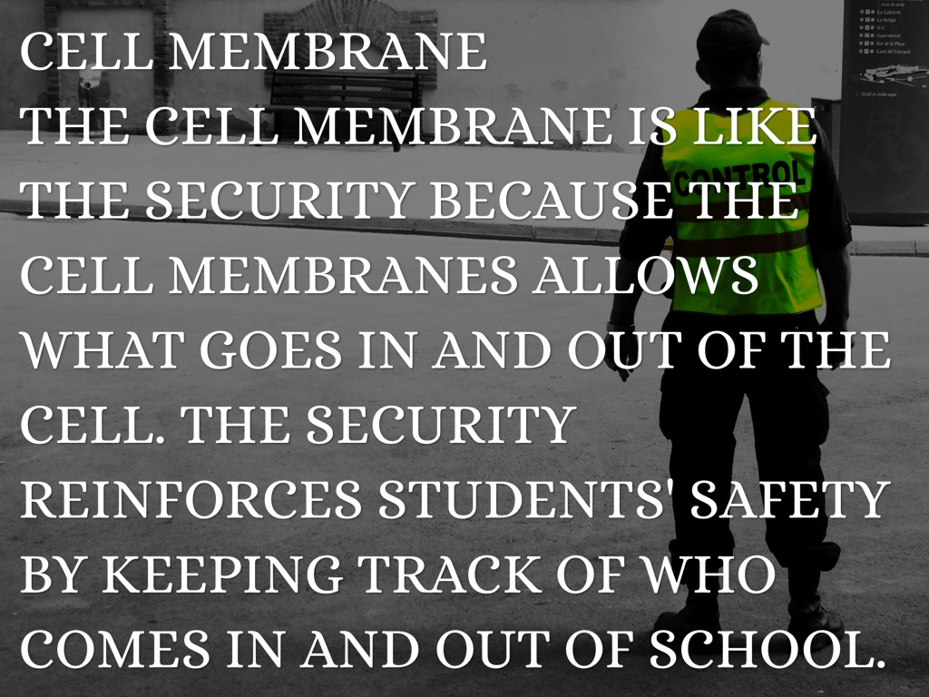 THE CELL MEMBRANE IS LIKE THE SECURITY BECAUSE THE CELL MEMBRANES ALLOWS WHAT GOES IN AND OUT OF THE CELL. THE SECURITY REINFORCES STUDENTS' SAFETY BY KEEPING TRACK OF WHO COMES IN AND OUT OF SCHOOL.