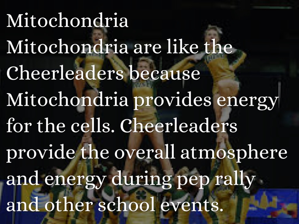 Mitochondria are like the Cheerleaders because Mitochondria provides energy for the cells. Cheerleaders provide the overall atmosphere and energy during pep rally and other school events.