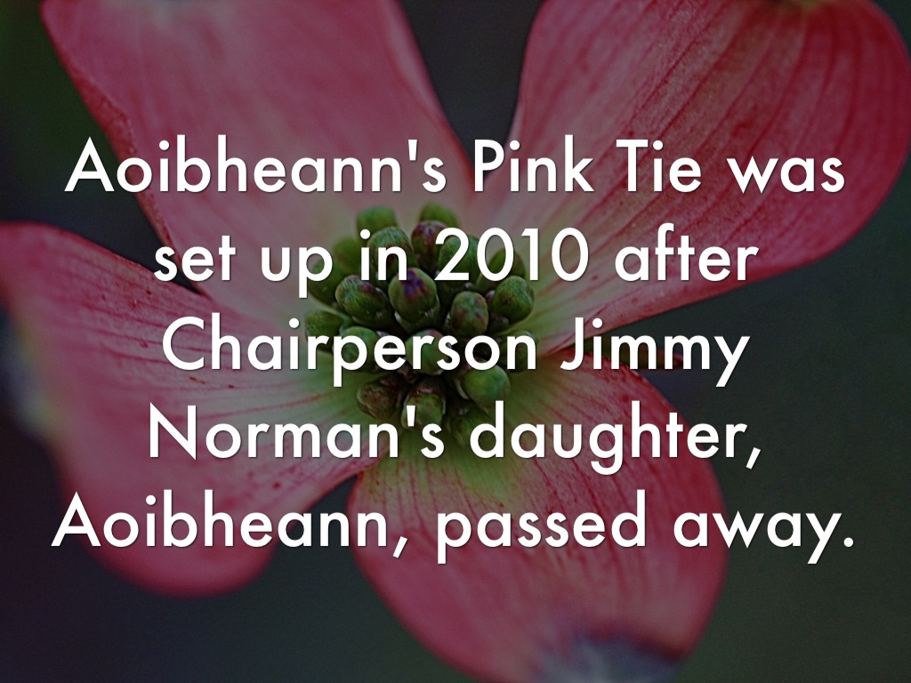 Aoibheann's Pink Tie was set up in 2010 after Chairperson Jimmy Norman's daughter, Aoibheann, passed away.