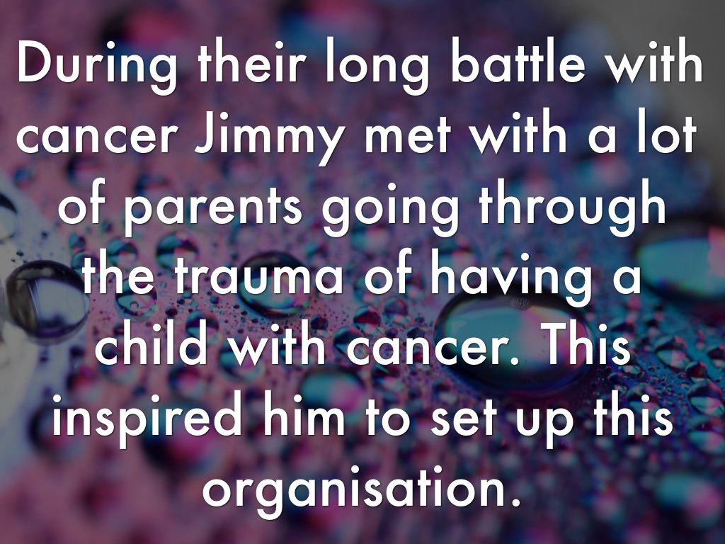 During their long battle with cancer Jimmy met with a lot of parents going through the trauma of having a child with cancer. This inspired him to set up this organisation.