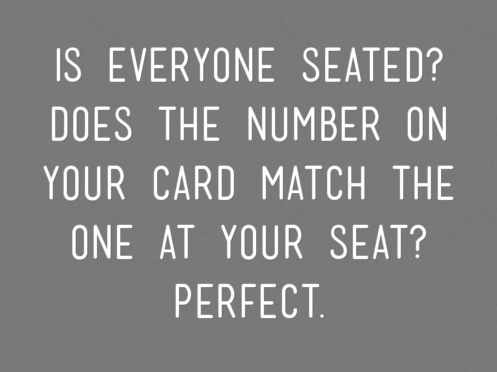 Is everyone seated? Does the number on your card match the one at your seat?