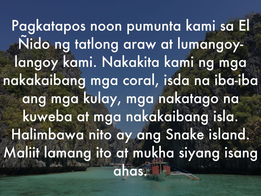 Pagkatapos noon pumunta kami sa El Ñido ng tatlong araw at lumangoy-langoy kami. Nakakita kami ng mga nakakaibang mga coral, isda na iba-iba ang mga kulay, mga nakatago na kuweba at mga nakakaibang isla. Halimbawa nito ay ang Snake island. Maliit lamang ito at mukha siyang isang ahas.