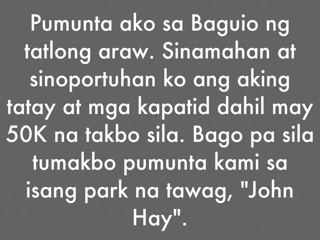 Pumunta ako sa Baguio ng tatlong araw. Sinamahan at sinoportuhan ko ang aking tatay at mga kapatid dahil may 50K na takbo sila. Bago pa sila tumakbo pumunta kami sa isang park na tawag, "John Hay".