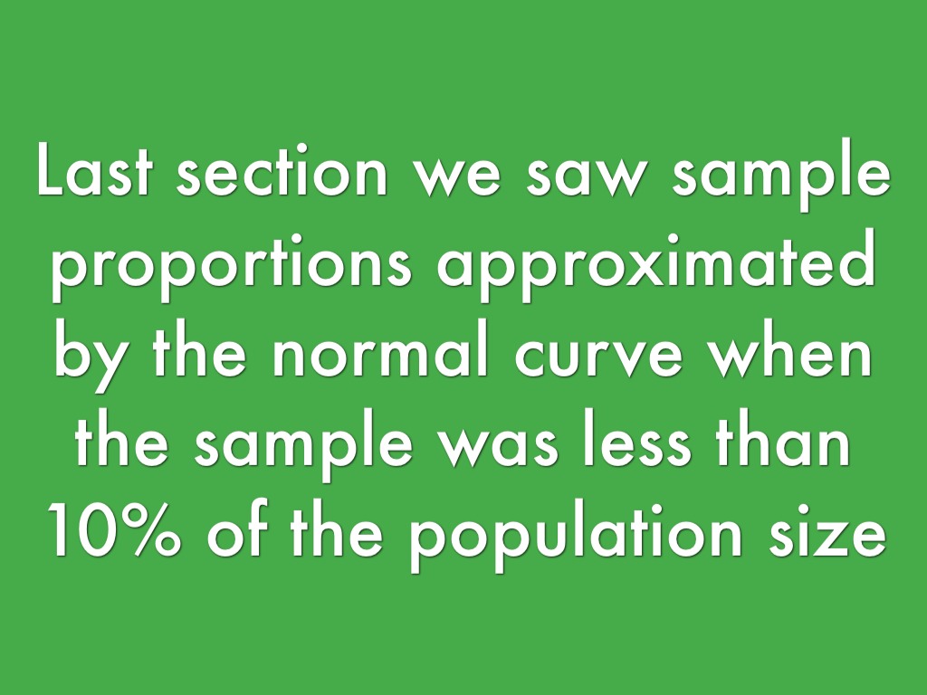 Last section we saw sample proportions approximated by the normal curve when the sample was less than 10% of the population size