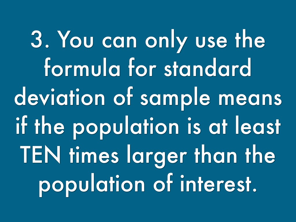 3. You can only use the formula for standard deviation of sample means if the population is at least TEN times larger than the population of interest.
