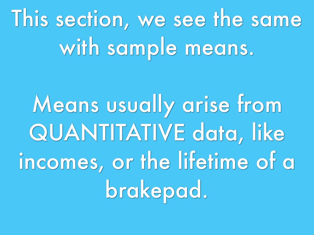 Means usually arise from QUANTITATIVE data, like incomes, or the lifetime of a brakepad.