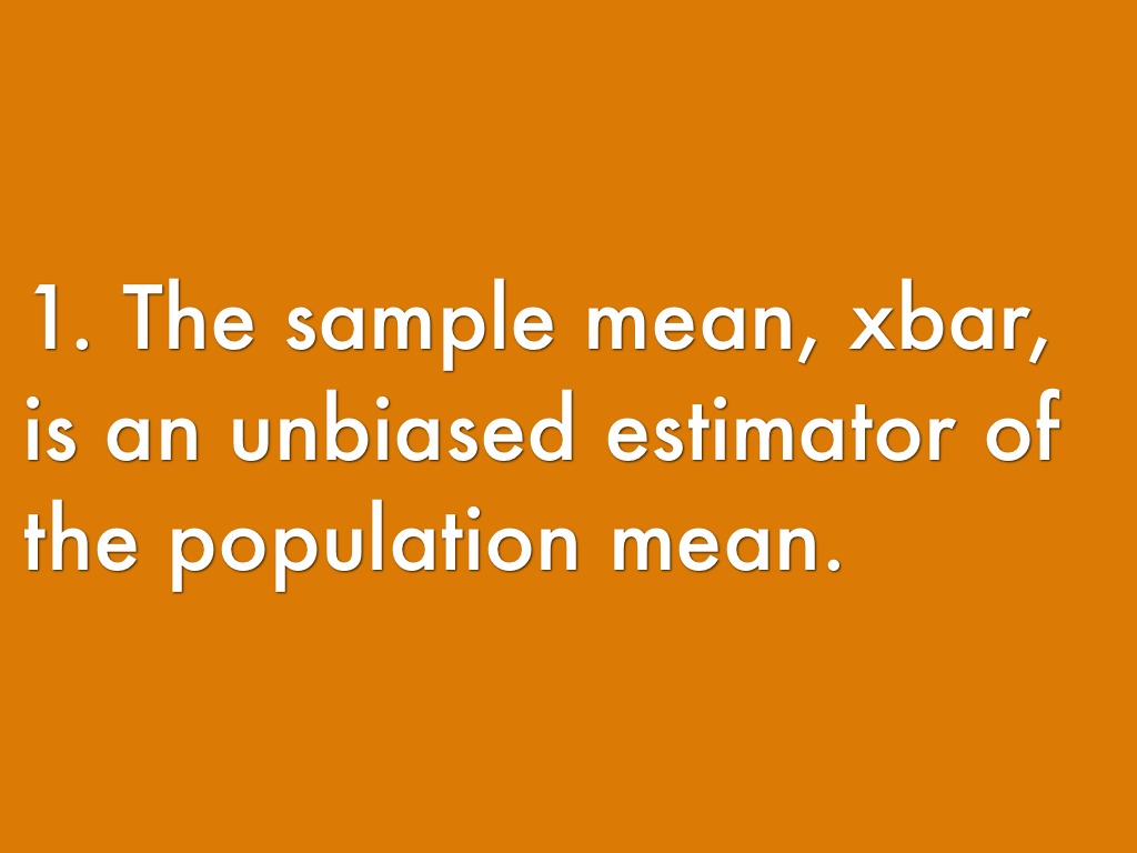 1. The sample mean, xbar, is an unbiased estimator of the population mean.