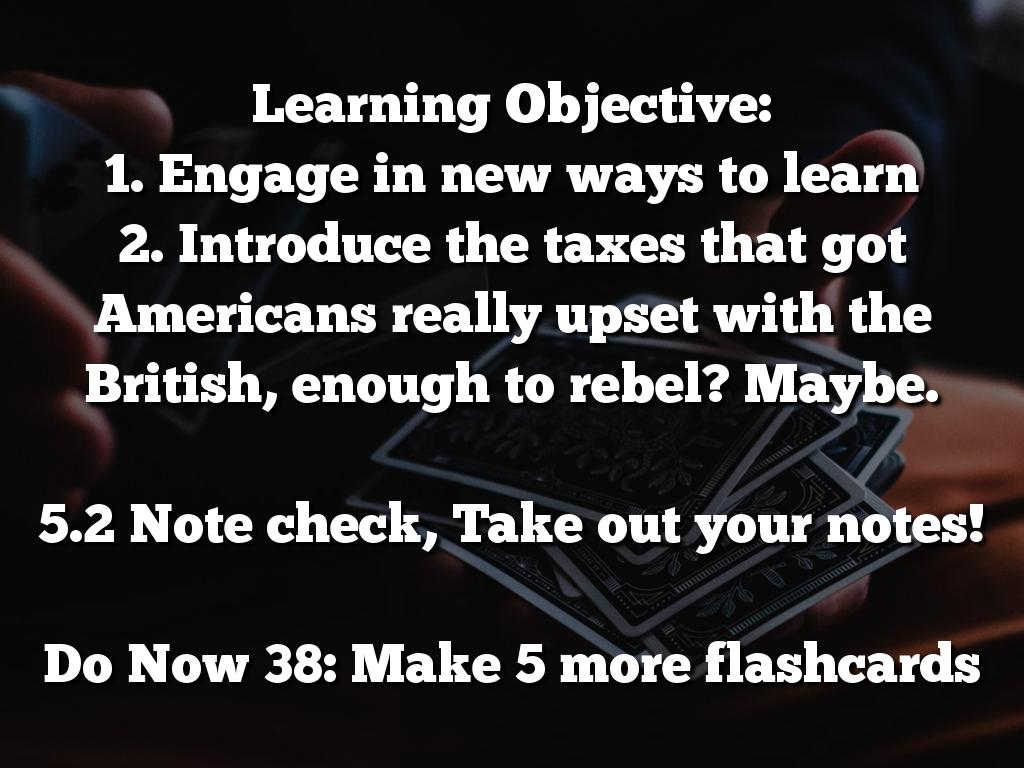 2. Introduce the taxes that got Americans really upset with the British, enough to rebel? Maybe.