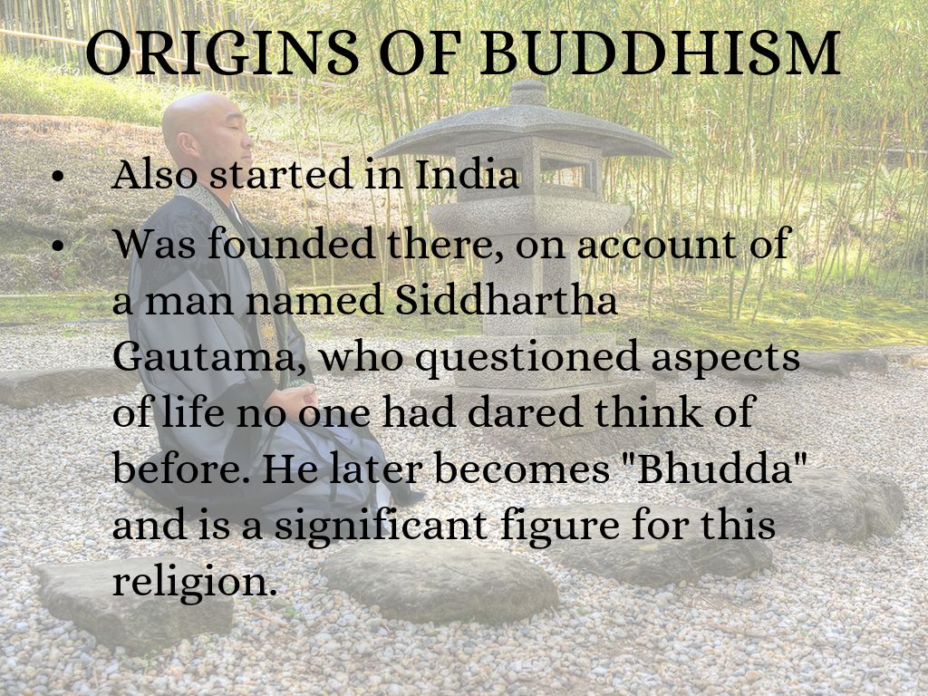 Was founded there, on account of a man named Siddhartha Gautama, who questioned aspects of life no one had dared think of before. He later becomes "Bhudda" and is a significant figure for this religion.
