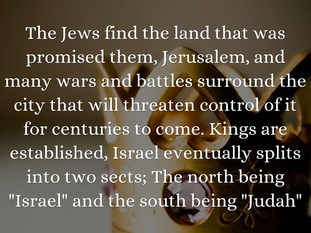 The Jews find the land that was promised them, Jerusalem, and many wars and battles surround the city that will threaten control of it for centuries to come. Kings are established, Israel eventually splits into two sects; The north being "Israel" and the south being "Judah"