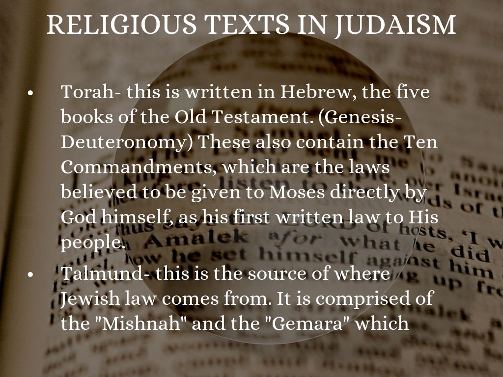 Torah- this is written in Hebrew, the five books of the Old Testament. (Genesis-Deuteronomy) These also contain the Ten Commandments, which are the laws believed to be given to Moses directly by God himself, as his first written law to His people.