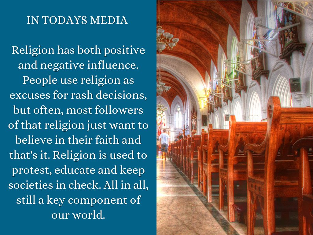 Religion has both positive and negative influence. People use religion as excuses for rash decisions, but often, most followers of that religion just want to believe in their faith and that's it. Religion is used to protest, educate and keep societies in check. All in all, still a key component of our world.