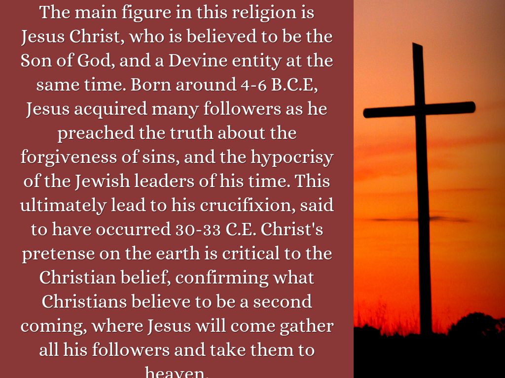 The main figure in this religion is Jesus Christ, who is believed to be the Son of God, and a Devine entity at the same time. Born around 4-6 B.C.E, Jesus acquired many followers as he preached the truth about the forgiveness of sins, and the hypocrisy of the Jewish leaders of his time. This ultimately lead to his crucifixion, said to have occurred 30-33 C.E. Christ's pretense on the earth is critical to the Christian belief, confirming what Christians believe to be a second coming, where Jesus will come gather all his followers and take them to heaven.