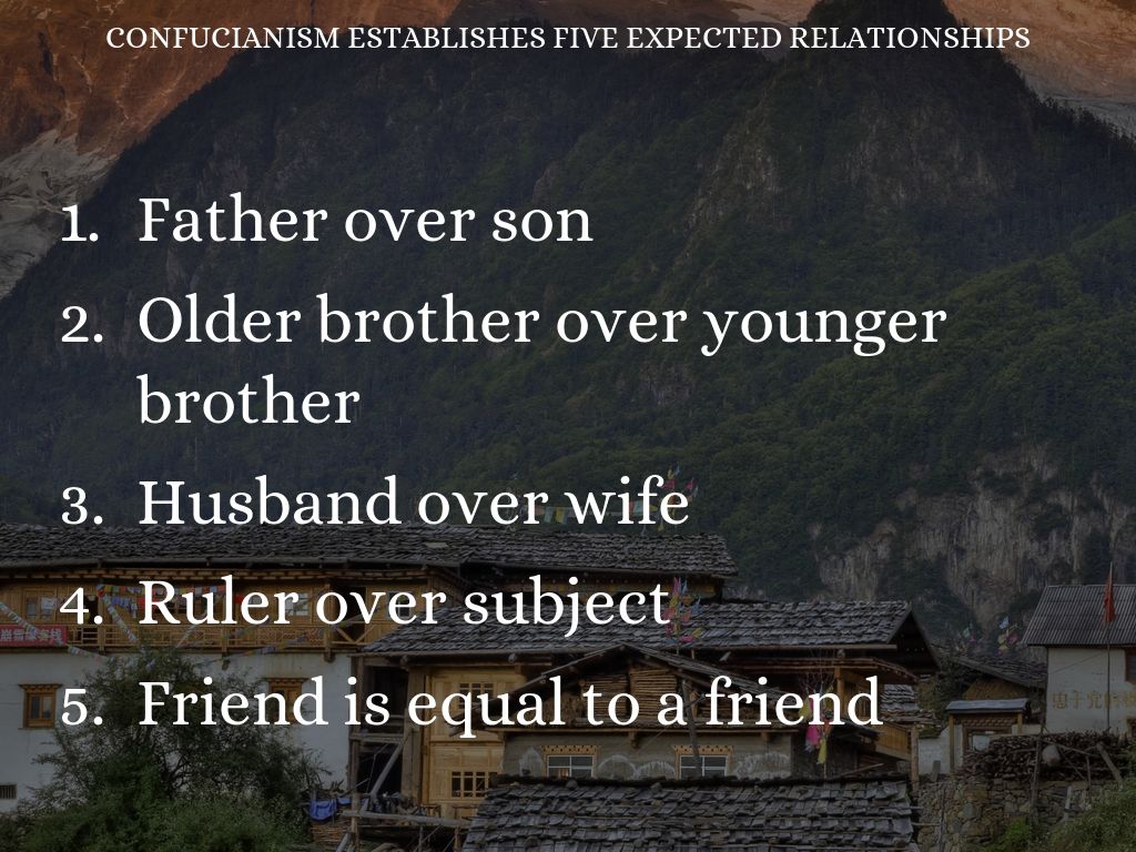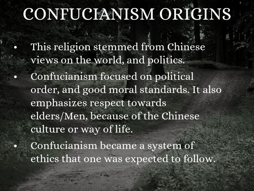 Confucianism focused on political order, and good moral standards. It also emphasizes respect towards elders/Men, because of the Chinese culture or way of life.