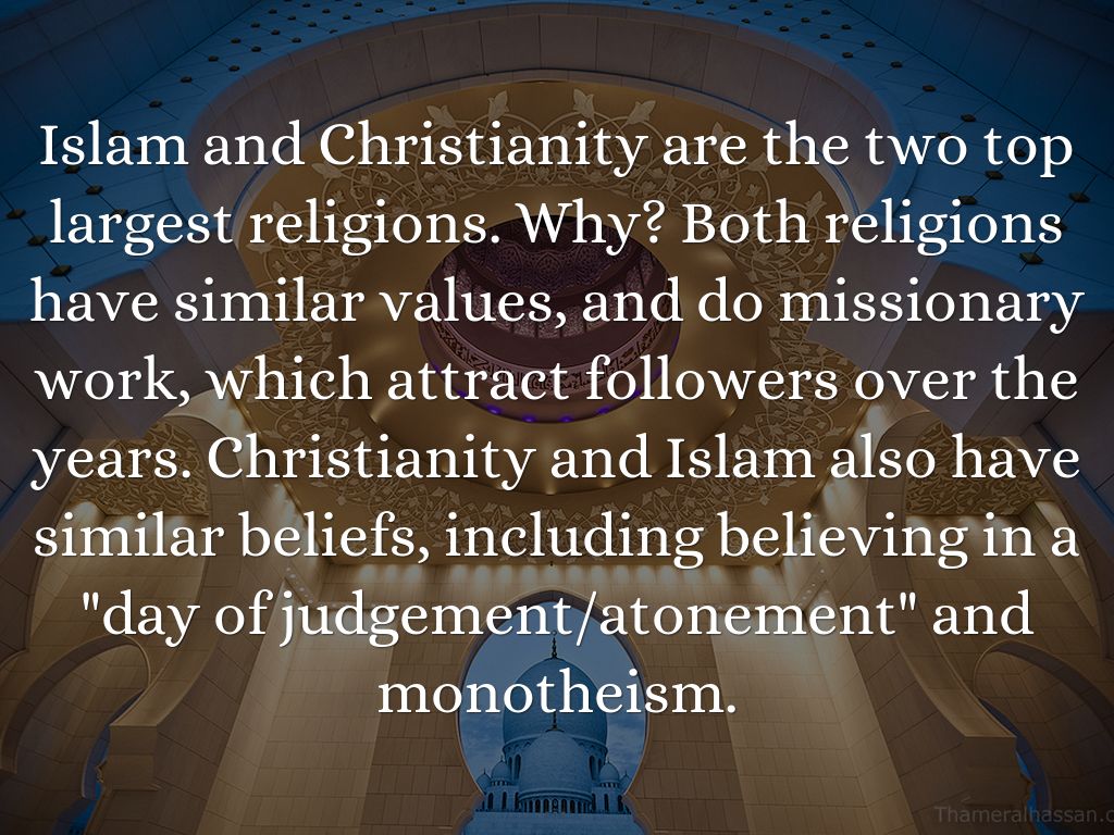 Islam and Christianity are the two top largest religions. Why? Both religions have similar values, and do missionary work, which attract followers over the years. Christianity and Islam also have similar beliefs, including believing in a "day of judgement/atonement" and monotheism.