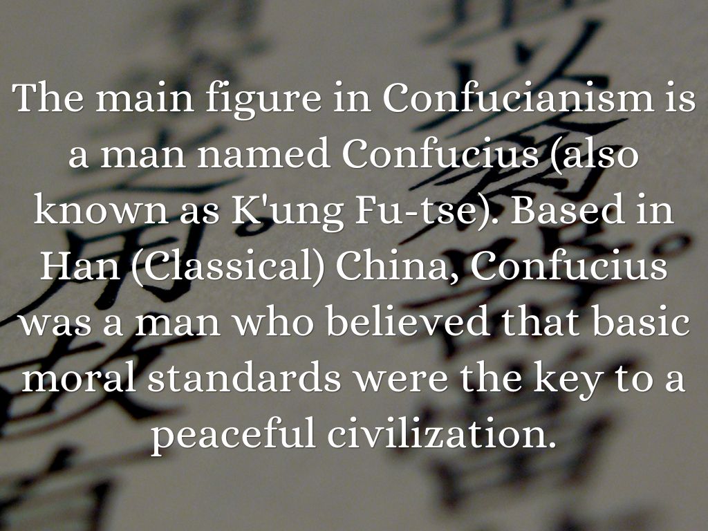 The main figure in Confucianism is a man named Confucius (also known as K'ung Fu-tse). Based in Han (Classical) China, Confucius was a man who believed that basic moral standards were the key to a peaceful civilization.