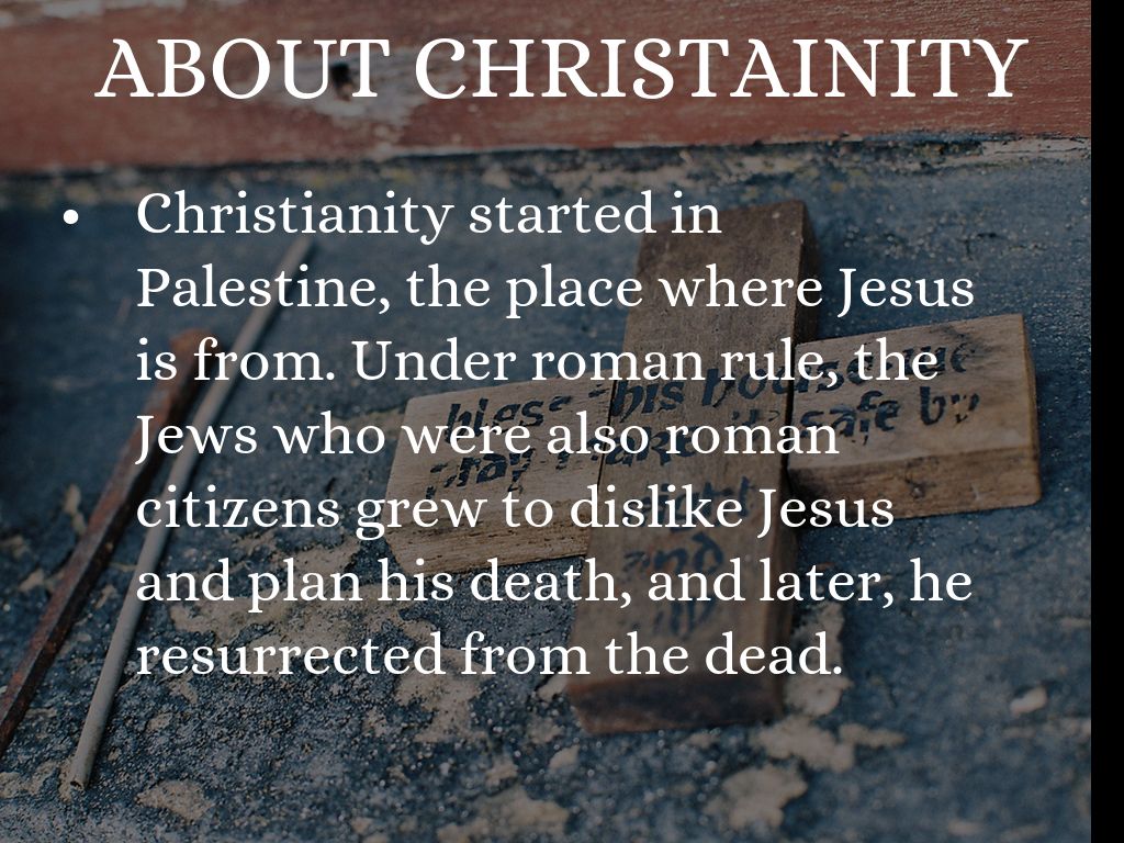Christianity started in Palestine, the place where Jesus is from. Under roman rule, the Jews who were also roman citizens grew to dislike Jesus and plan his death, and later, he resurrected from the dead.