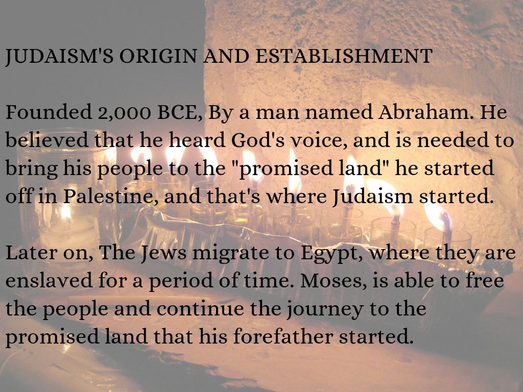 Founded 2,000 BCE, By a man named Abraham. He believed that he heard God's voice, and is needed to bring his people to the "promised land" he started off in Palestine, and that's where Judaism started.
