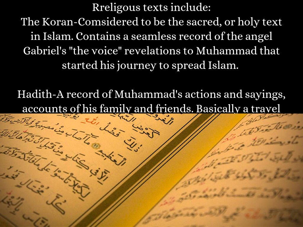 Rreligous texts include: The Koran-Comsidered to be the sacred, or holy text in Islam. Contains a seamless record of the angel Gabriel's "the voice" revelations to Muhammad that started his journey to spread Islam.