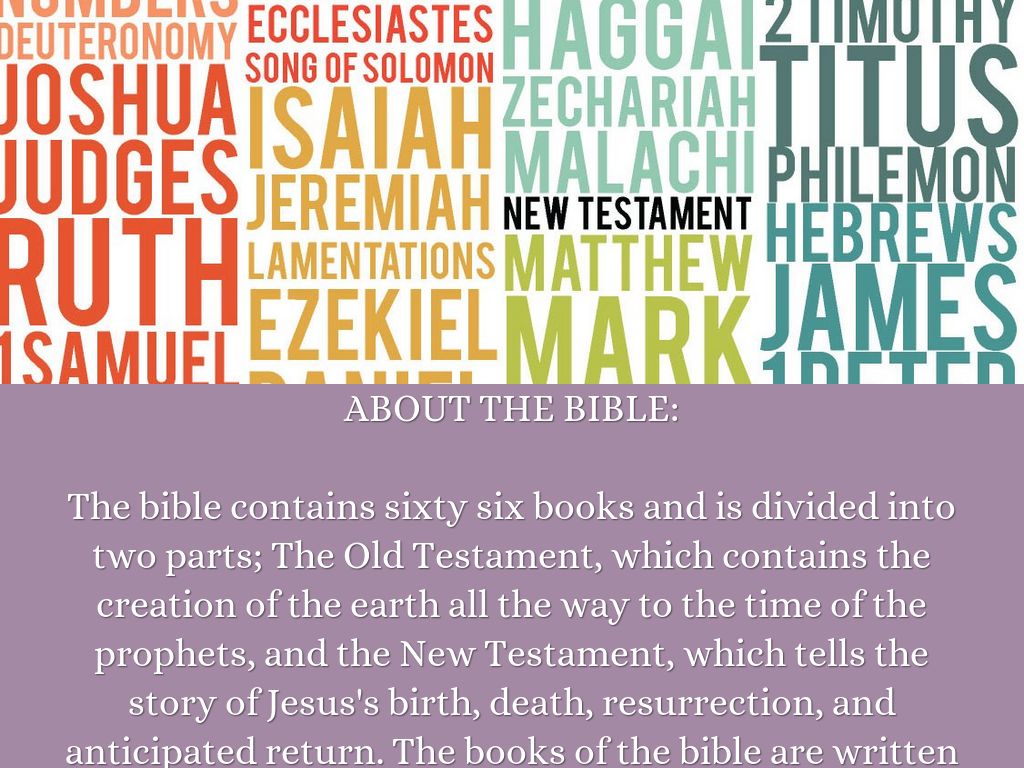 The bible contains sixty six books and is divided into two parts; The Old Testament, which contains the creation of the earth all the way to the time of the prophets, and the New Testament, which tells the story of Jesus's birth, death, resurrection, and anticipated return. The books of the bible are written by various authors, including prophets, Kings, a doctor, a priest, and some of Jesus's disciples. The Bible contains stories of miraculous accounts involving God and His people, along with a guide to good Christian living and moral code that Christians believe and abide by.