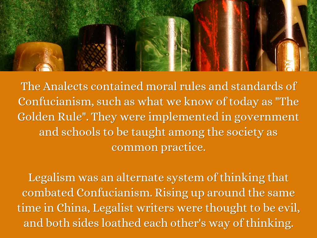The Analects contained moral rules and standards of Confucianism, such as what we know of today as "The Golden Rule". They were implemented in government and schools to be taught among the society as common practice.